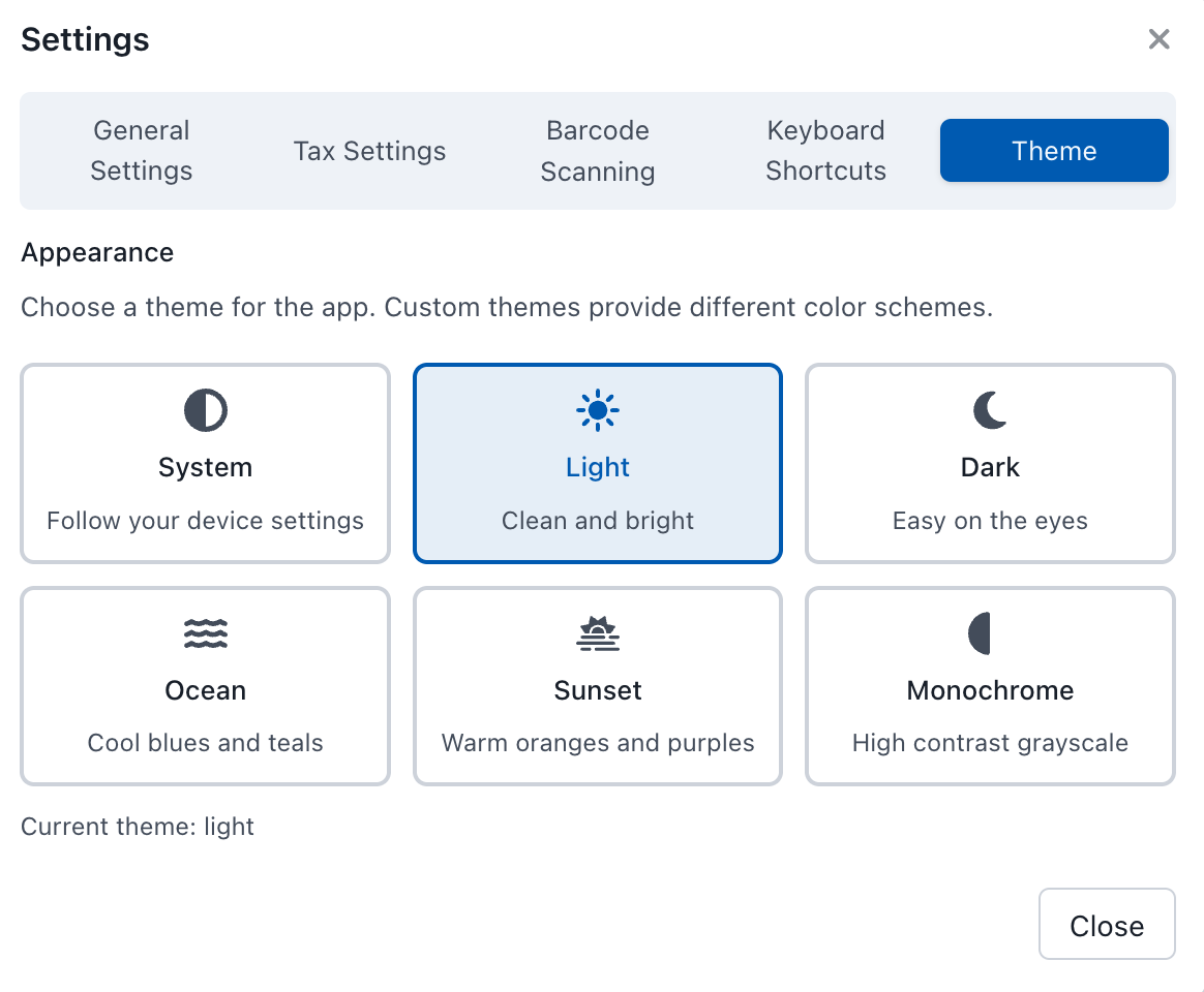 Passen Sie das Erscheinungsbild Ihrer POS-Anwendung mit verschiedenen Themes und Farbschemata an.