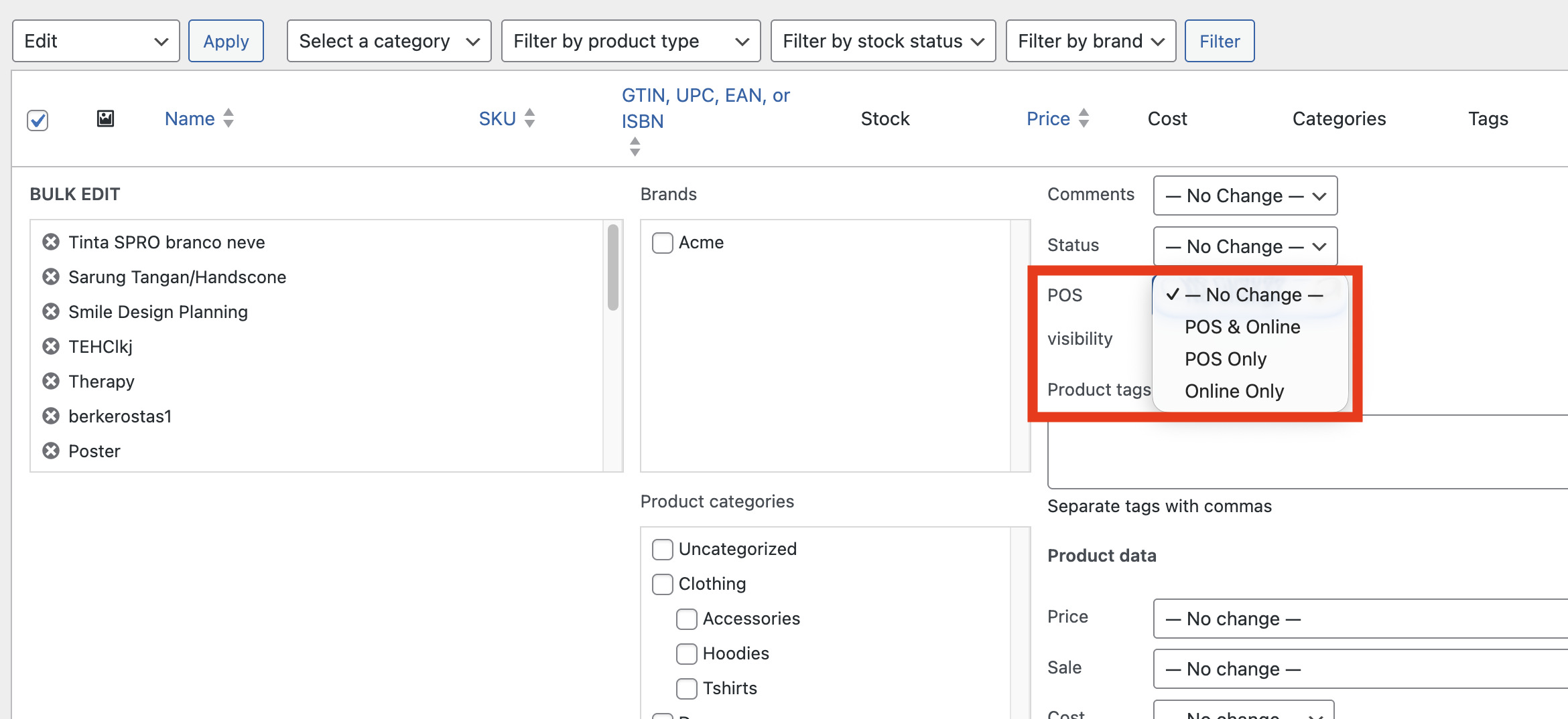 - थोक संपादन पैनल में, POS Visibility ड्रॉपडाउन खोजें