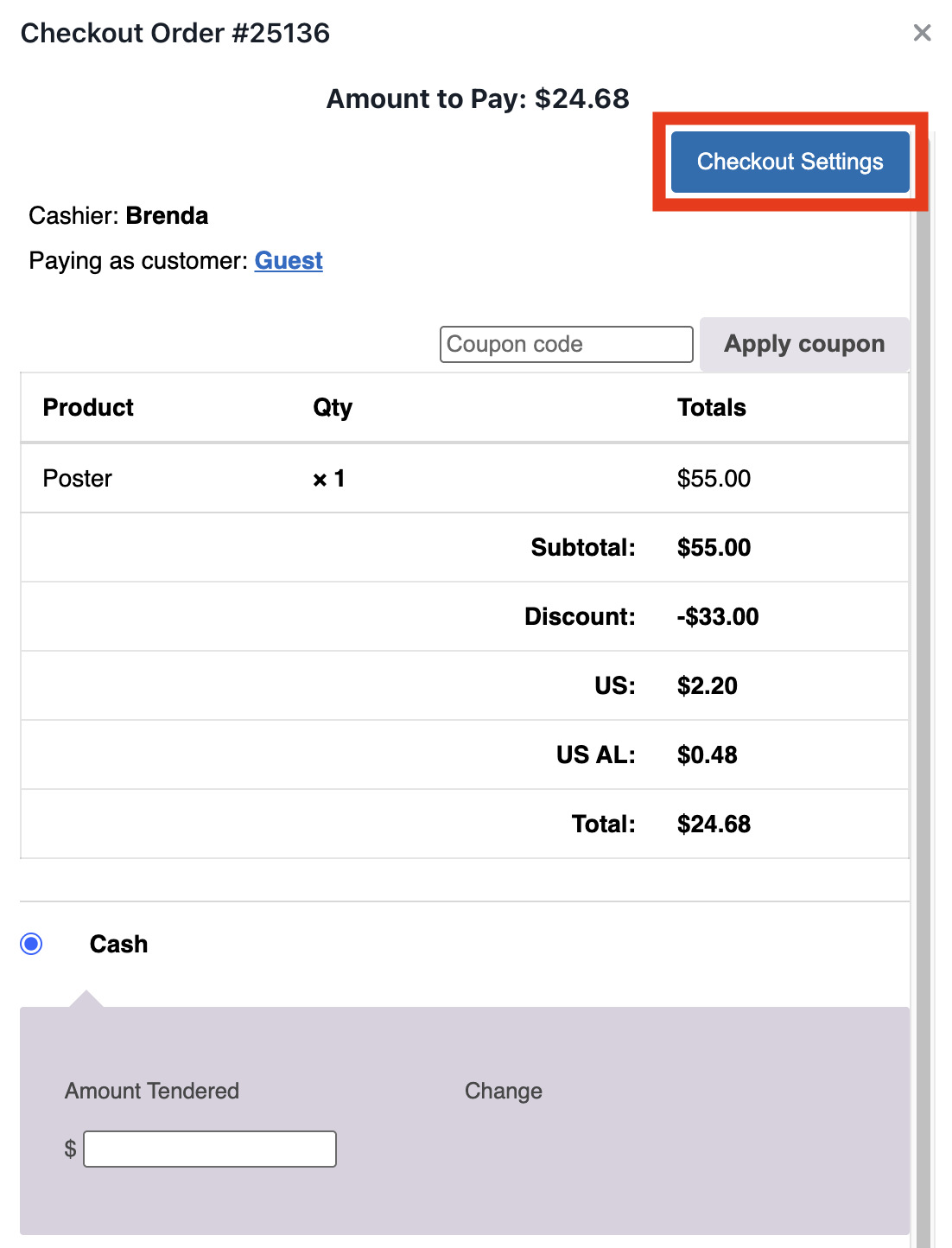 - Cash - With amount tendered and change calculator
